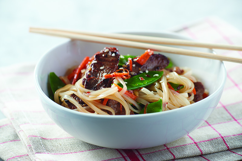 Asian Beef Stir Fry With Rice Noodles NUTRITIONALS PER SERVING: 600 Calories; 29g Fat; 43g Carbs; 4g Fiber; 11g Sugar; 40g Protein 2 ounces dried rice noodles 1 tablespoon olive oil 12 ounces sirloin steak, cut into thin 2-inch strips 1/2 cup snow peas, trimmed 1/2 cup carrots, cut into 1/4-inch sticks 3/4 cup… Continue reading Asian Beef Stir Fry With Rice Noodles