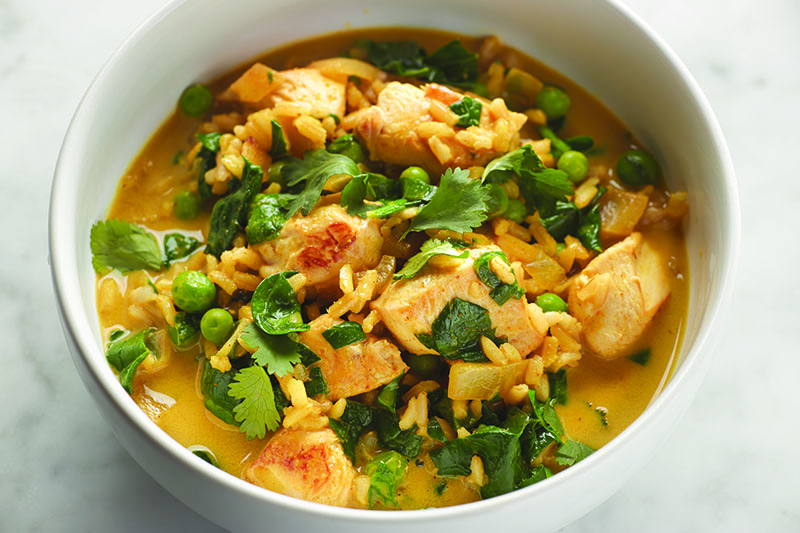 Thai Chicken and Rice Bowl 406 Calories 1 tbsp olive oil 2 6 ounce boneless, skinless chicken breasts, cut into 1-inch pieces 1 cup chopped yellow onion 3/4 cup low-sodium chicken broth 2/3 cup frozen peas 1/4 cup lite coconut milk 2 tbsp lime juice 2 1⁄2 tsp curry powder 2 cups frozen chopped spinach… Continue reading Thai Chicken and Rice Bowl
