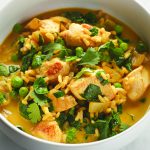 - Add chicken broth, peas, coconut milk, lime juice, and curry powder to the skillet and, stirring occasionally, let cook 5 minutes.